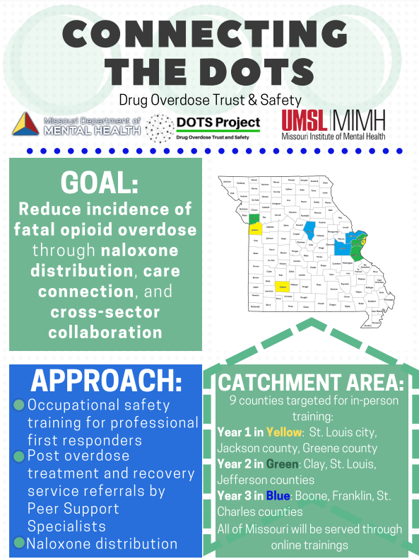 The DOTS project builds upon the impactful work already underway in Missouri to address the opioid crisis. Through comprehensive and cross-sectoral trainings, we develop and carry out a more intentional approach to addressing occupational safety concerns for first responders. By integrating safety and public-health oriented responses into trainings and facilitating partnerships between first responders and community-based service providers, we aim to transform interactions between first responders and people who use drugs. In addition, we establish collaborations between first responders and public health entities that enhance resource networks in high-need communities and facilitate survivors getting connected with services post-overdose. Click the button below to learn more: