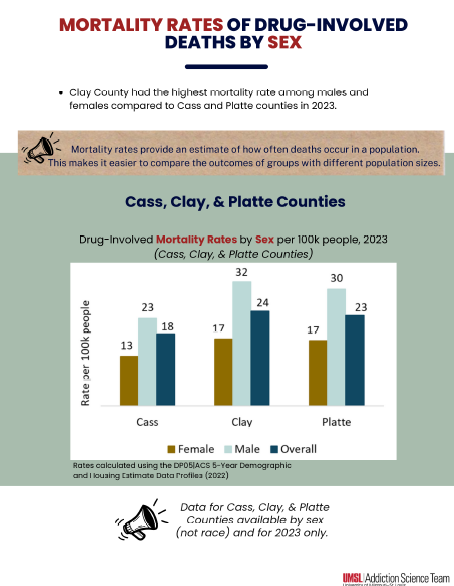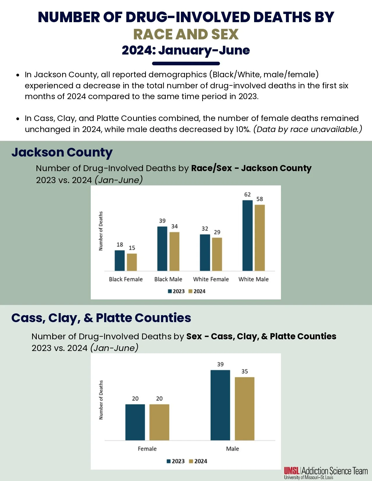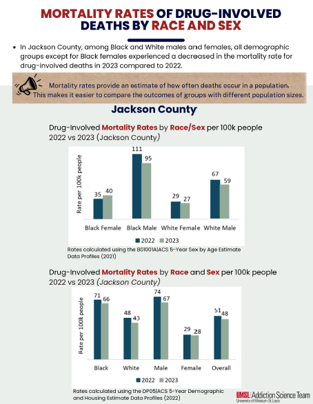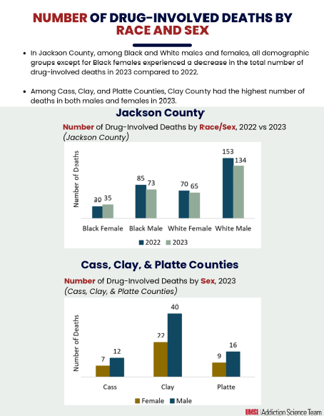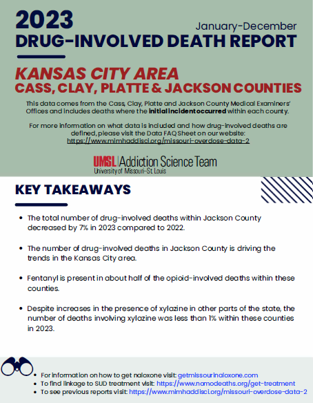 On this page, you will find reports on Kansas City Area (Cass, Clay, Platte, and Jackson Counties) drug-involved deaths based on information received from the corresponding Medical Examiners’ offices. If you have any additional questions about this information, please reach out to our team at nomodeaths@mimh.edu.