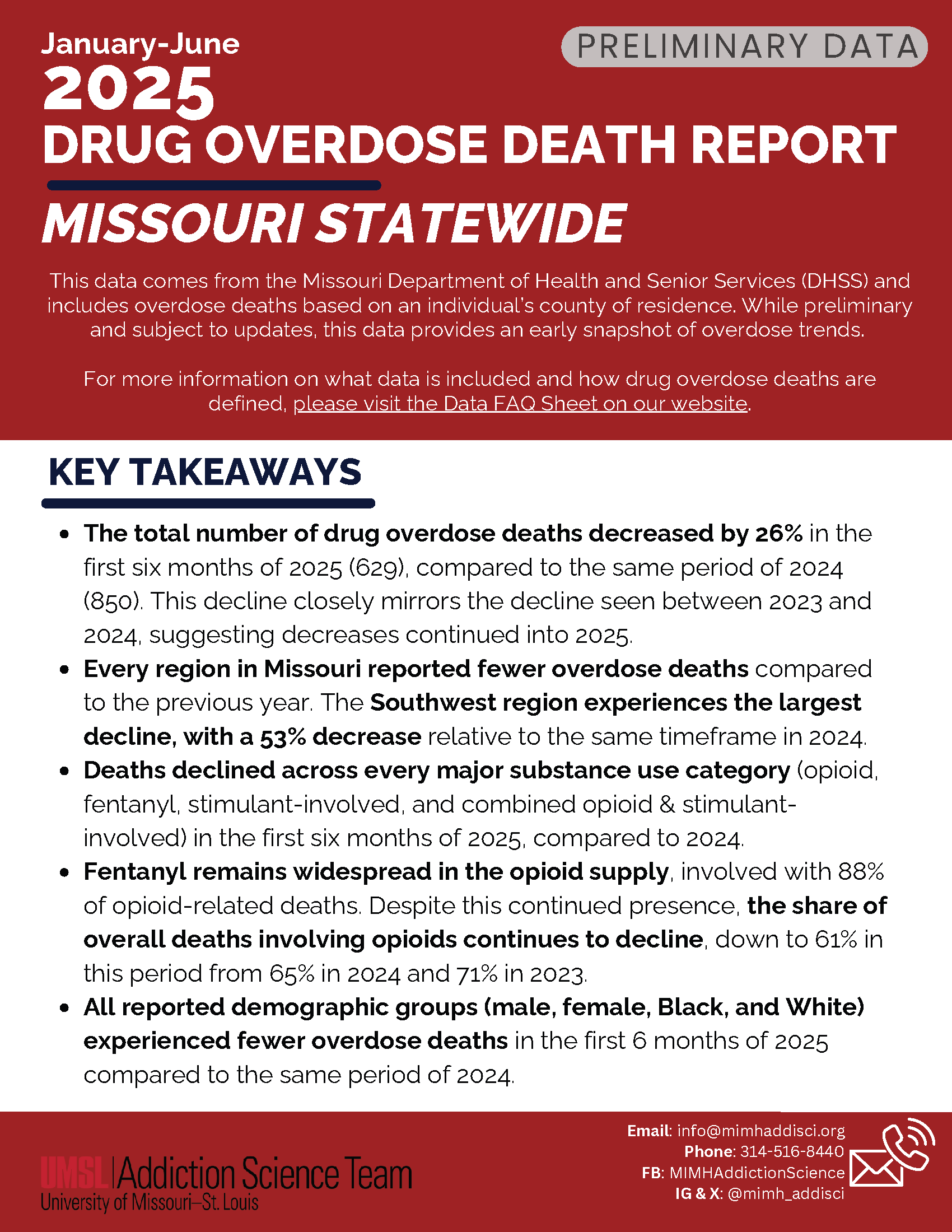 On this page you will find reports on MO statewide overdose mortality. Reports are ordered from the most recent to the oldest. You may also find additional information on the MO Department of Health and Senior Services Dashboard located here. If you have any additional questions about this information, please reach out to our team at nomodeaths@mimh.edu.