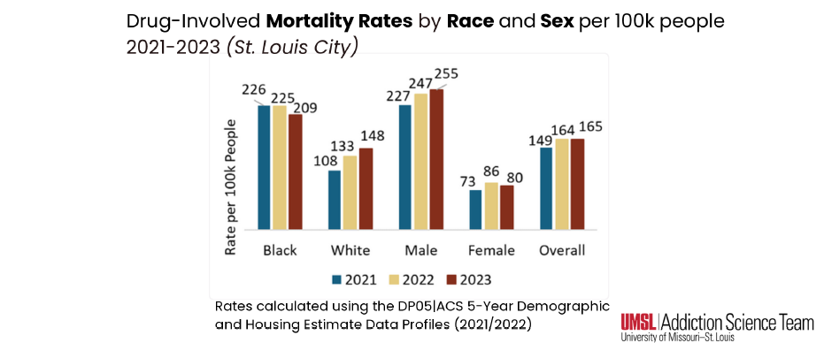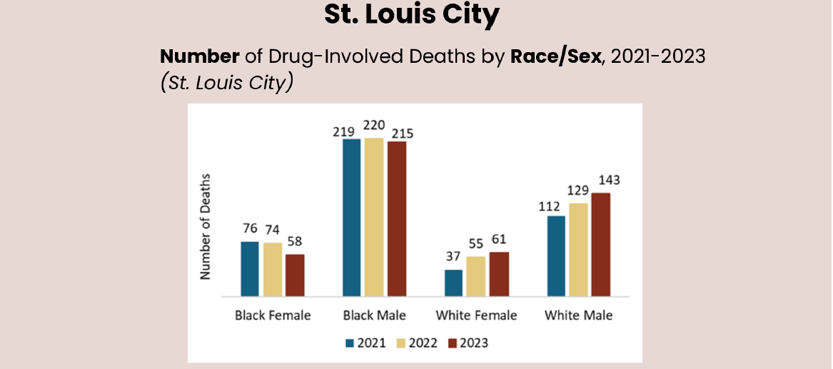 Black men in St. Louis City remain the group most affected by drug-involved deaths by count and population-adjusted rate.
