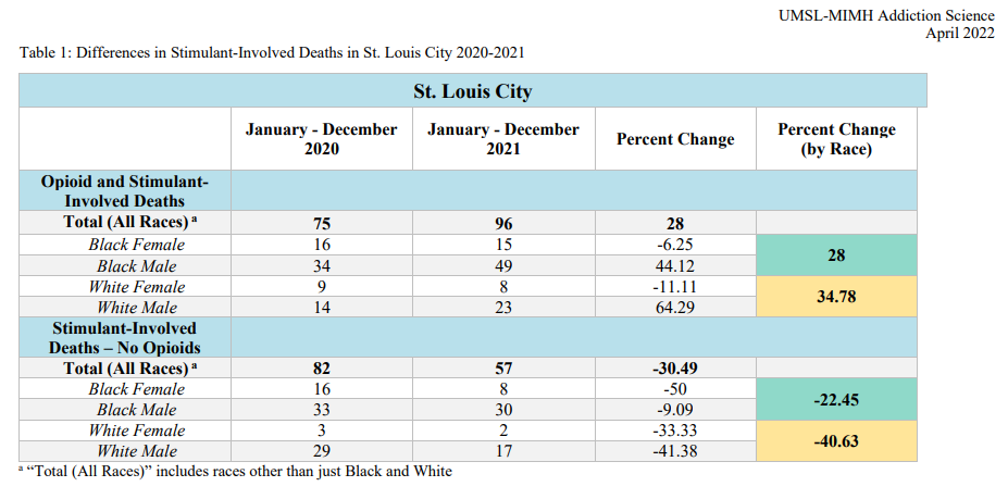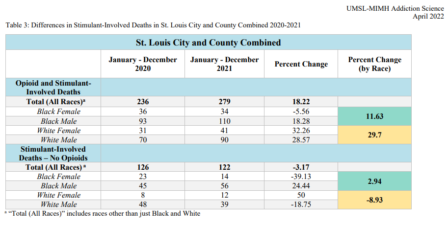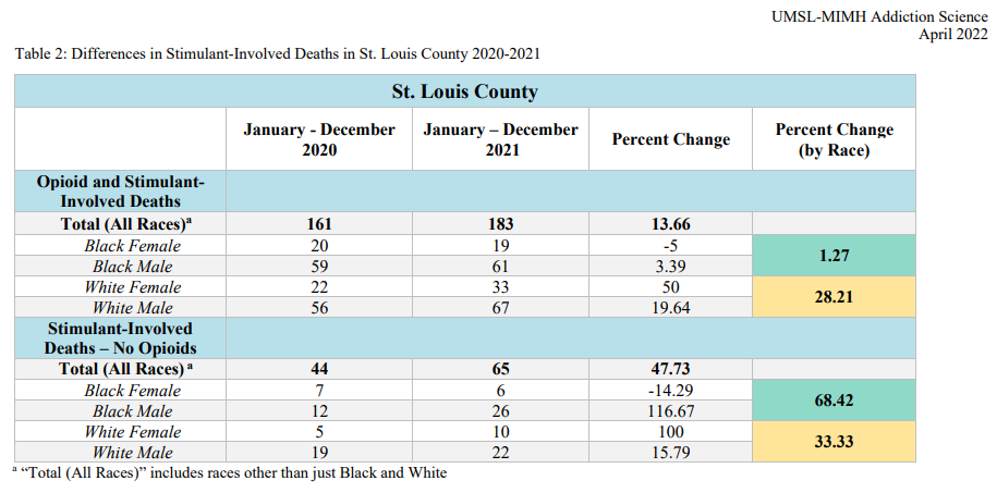 In St. Louis County, the total number of stimulant-involved deaths across all races increased by 48% in 2021 compared to 2020.