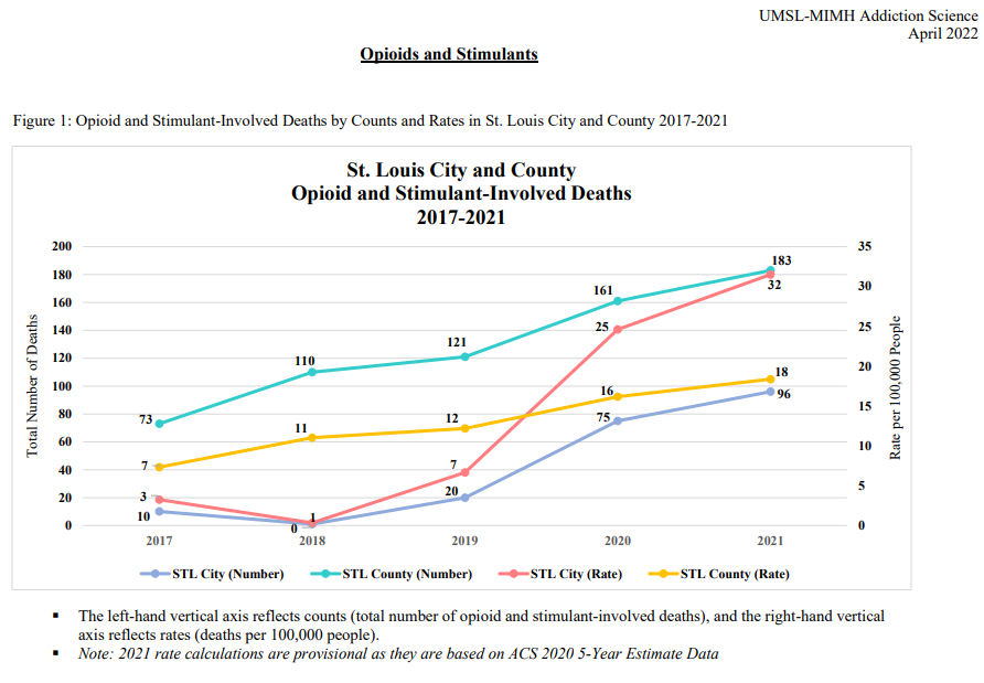 ▪ Overall, in St. Louis City and County combined, opioid and stimulant-involved deaths increased by 18% in 2021 compared to 2020.