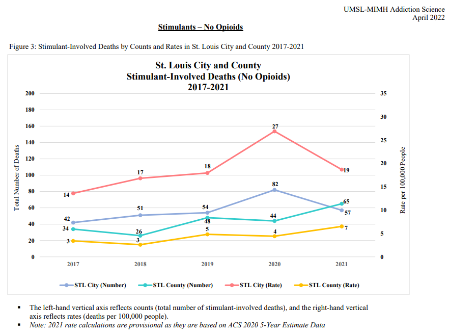 Overall, in St. Louis City and County combined, stimulant-involved deaths (with no evidence of opioids being present) decreased by 3% in 2021 compared to 2020.
