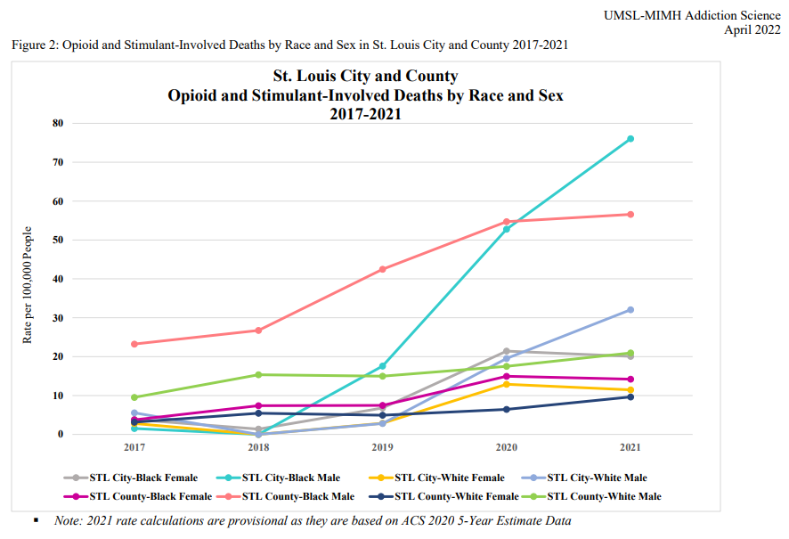 ▪ In 2017, 2018, 2019, 2020, Black males in St. Louis County had the highest rates of opioid and stimulant combined deaths, and in 2021, Black males in St. Louis City had the highest rates.