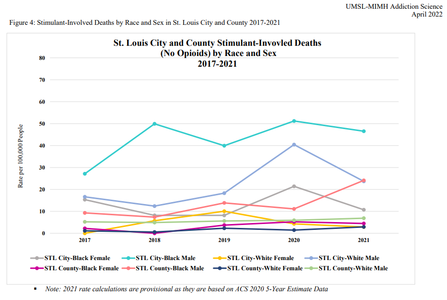 From 2017-2021, Black males in St. Louis City had the highest rates of stimulant-involved deaths followed by St. Louis City White males.