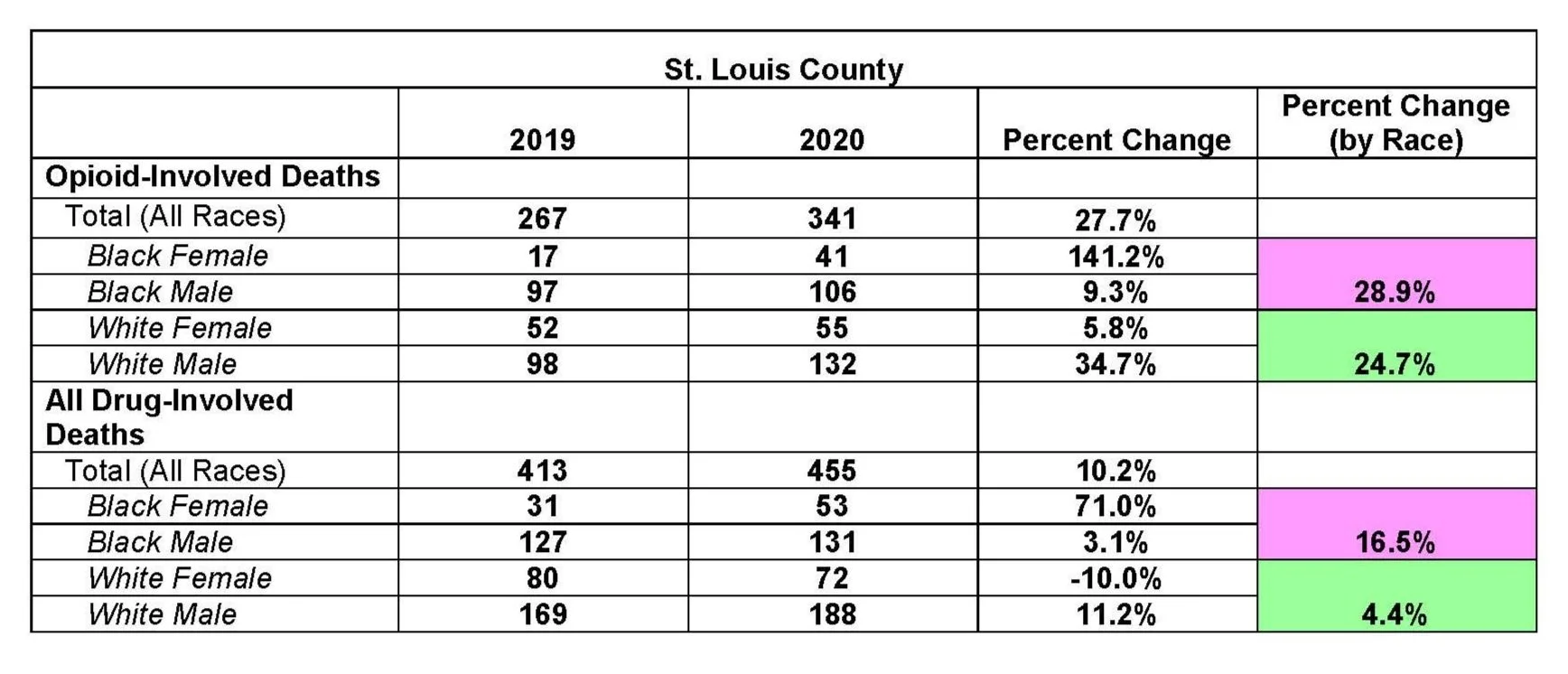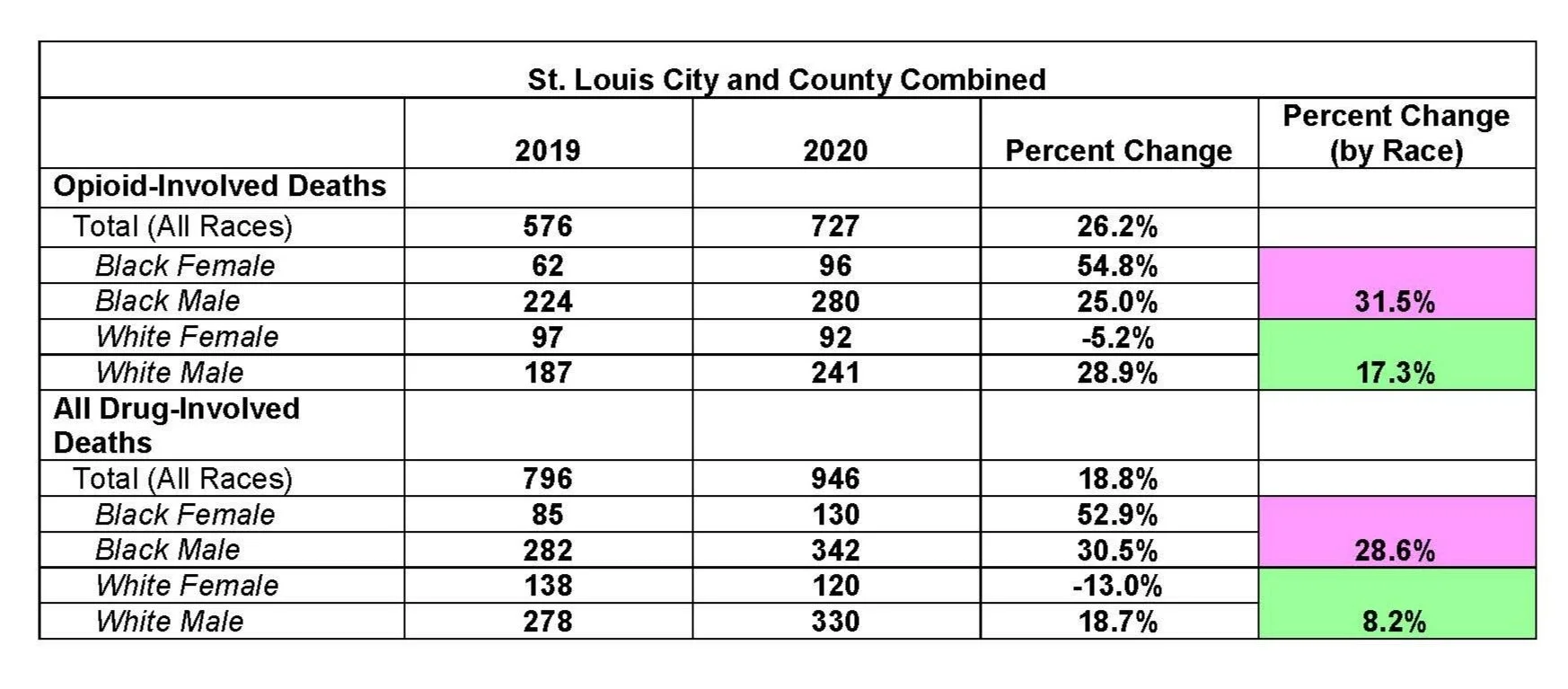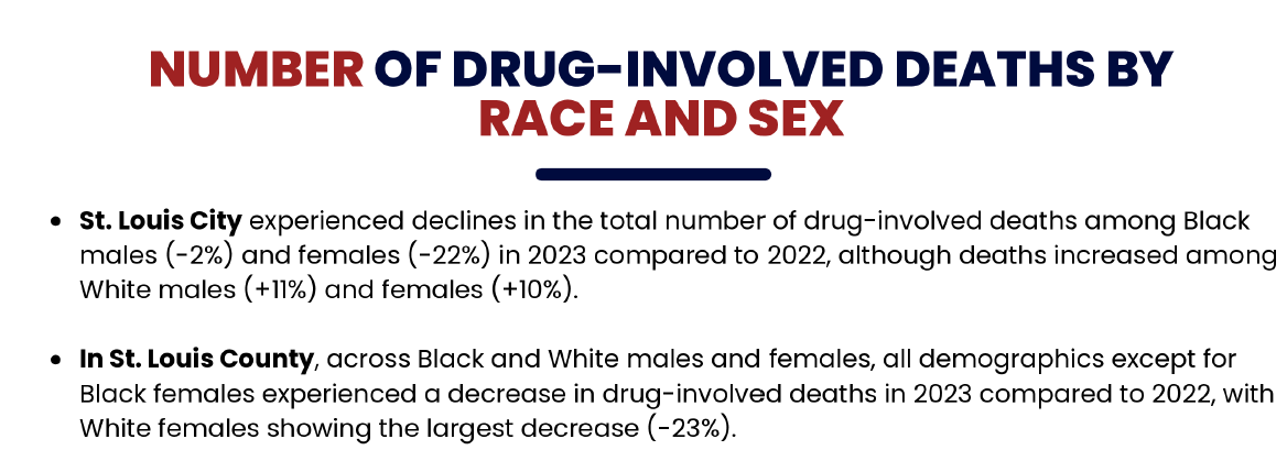 Among Black individuals, all drug-involved deaths increased in both St. Louis City (+2%) and in St. Louis County (+16%).