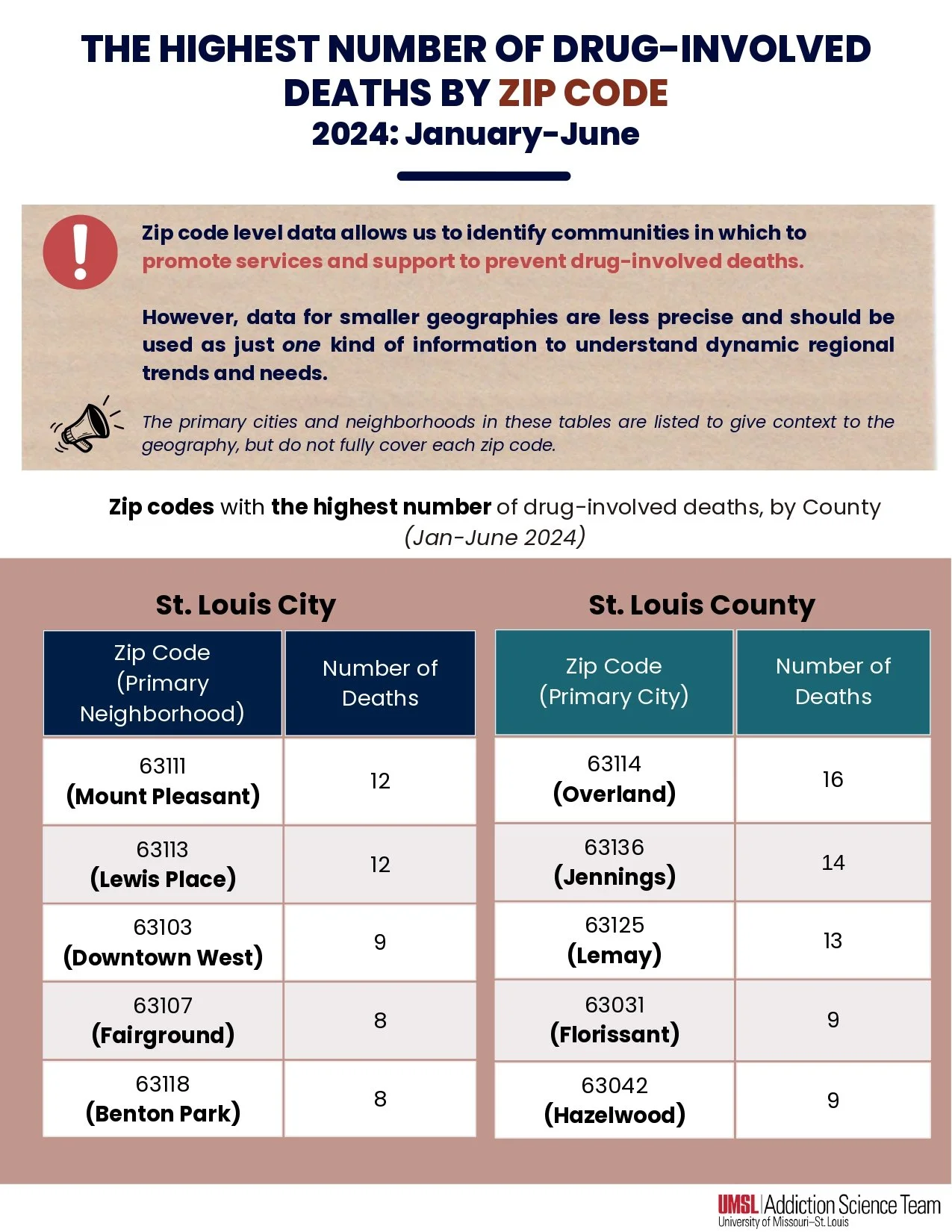 To cite this source: University of Missouri, St. Louis‐Missouri Institute of Mental Health Addiction Science Team, St. Louis City and St. Louis County Medical Examiners. (2022). The American Community Survey. (2016‐2020). STL City/County OD Rates by Top 5 Residential Zip Codes. (2020‐2021). Retrieved https://www.mimhaddisci.org/missouri-overdose-data